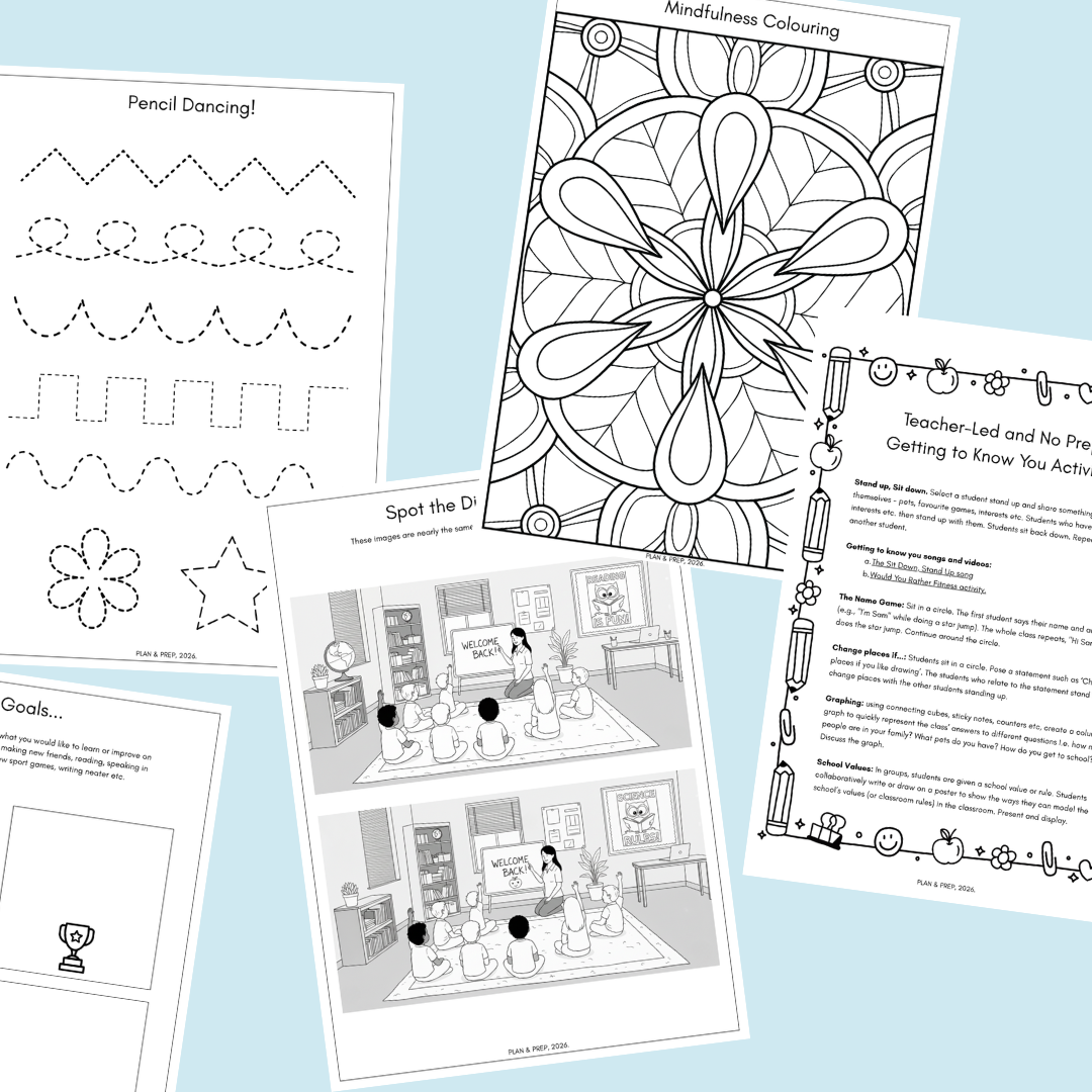 Head into the new school year feeling confident and prepared with activities for the first few days. Suitable for K-2. The booklet includes 14 pages of activities, plus 5 teacher-led zero prep games and activities: